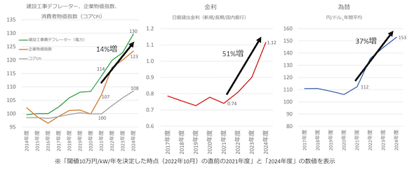 現行の長期脱炭素電源オークションでは、落札価格は、1年毎に消費者物価指数(コアCPI)で物価補正を行うこととしている。しかしながら、昨今のインフレによる建設費・金利の上昇や、為替変動の状況を踏まえれば、事後的な費用変動リスクへの対応としては不十分な面があると考えられる。