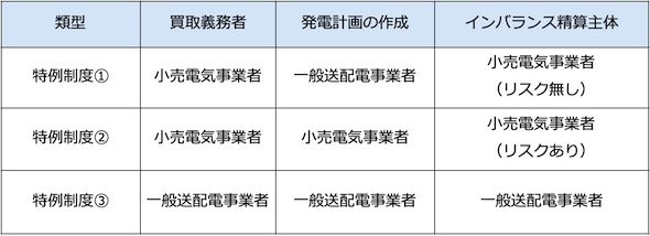 現在、日本の変動性再エネ電源(VRE)には、FIT電源・FIP電源・非FIT/FIP電源の3タイプがあるが、FIT電源は「買取義務者」がその全量を買い取ることが義務付けられている。また、VREの出力変動によるインバランスリスクを「買取義務者」が負うことを避けるため、表1のような3つのインバランス特例制度が設けられている。なお、2017年に買取義務者が小売電気事業者から一般送配電事業者(TSO)に変更されたため、特例①②電源は2017年以前のものに限られる。