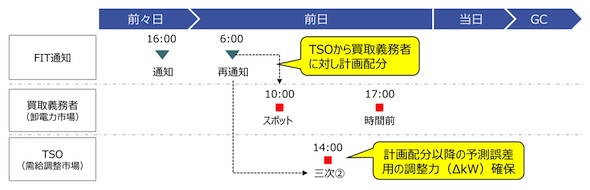 さらにFIT特例①では、買取義務者(小売事業者)についても、自社でVREの発電量予測をする必要はなく、TSOが予測し作成した発電量計画値の通知を受け、それをそのまま自社の発電計画として提出する簡便な仕組みとしている。TSOによるFIT発電量の計画配分は、1回目の通知が前々日の16時まで、2回目の通知(再通知)が前日6時までに行われる。