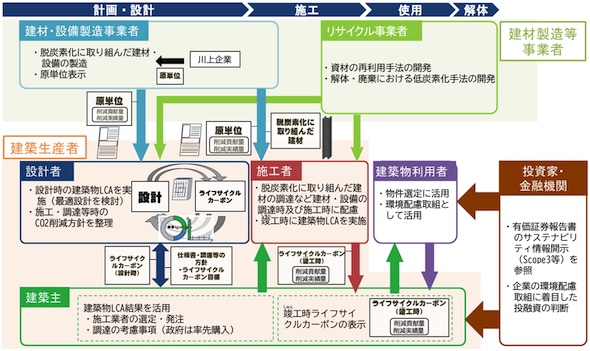 今後、建築生産者・建材製造等事業者等による脱炭素化の取り組みが、建築物LCAの実施により、建築物のライフサイクルカーボンとして可視化が進むと期待される。また、ライフサイクルカーボンが削減された建築物は、建築物利用者や投資家・金融機関によって評価され、脱炭素化に取り組む建材・設備や建築物への需要が拡大すると期待される。