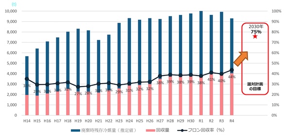 エアコンの冷媒などに使われる代替フロン(HFCs)は、CO2の数十〜1万倍以上の非常に高い温室効果を持つガスであるが、エアコン等機器の使用中や建築物の解体時点で、大気中に漏洩・放出することが問題となっている。機器廃棄時のフロン回収率は、直近で4割程度に低迷しており、旧・地球温暖化対策計画で目標とされていた2030年目標の75%にも大きなギャップが残されている。