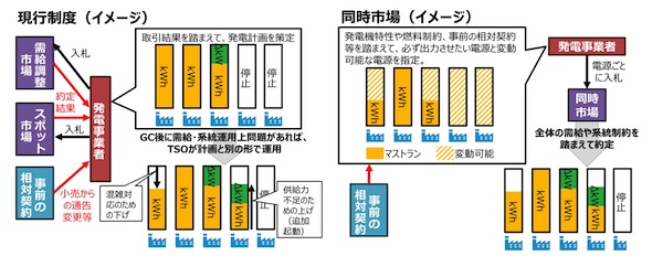 現在、国(資源エネルギー庁・電力広域的運営推進機関)は、電力の安定供給と経済性の両立を求め、kWhとΔkWを同時約定し最適化する「同時市場」の導入に向けた検討を進めている。同時市場では、主に火力発電の特性を念頭に、起動費や最低出力費用、限界費用といったThree-Part情報に基づき、系統制約を考慮した上で、電源の起動停止(SCUC)や出力量(SCED)の決定が行われる。