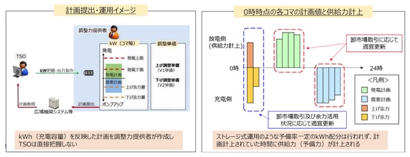 なお、蓄電池は一般的に揚水発電と比べて小規模で設備数が多いため、すべてをTSOの中給システムで管理することは困難である。このため、専用線オンライン接続された10MW以上の蓄電池ではストレージ式運用として、それ以外の蓄電池では、TSOがkWhを管理しない簡易な運用としている(非ストレージ式運用)。