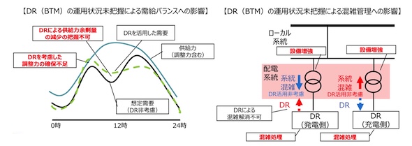 TSOは気温や気象等から需要変動を想定しているが、見えないDR(BTM)が行われることにより、下がるはずの需要が下がらず(又はその逆)、TSOは正確な需要想定や潮流想定を行うことが困難となる。これにより、調整力確保量の過不足や再エネ出力制御の過不足、混雑処理量の過不足や系統設備増強の過不足が生じ、安定供給への支障や費用増加の原因となると懸念される。