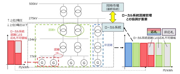 ローカル系統に接続するDERリソースは、ローカル系統の混雑状況によっては出力(応札)できない領域もあるため、それらの制約を無視して同時市場に応札し約定すると、約定結果に従うことができない(もし従うとローカル系統混雑が発生する)状況となる。