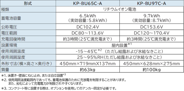 また、使用周囲温度範囲の下限温度を従来機の-10℃から-15℃に拡張。-15℃以上で充放電が可能となったことで、より寒い地域への導入もしやすくした。