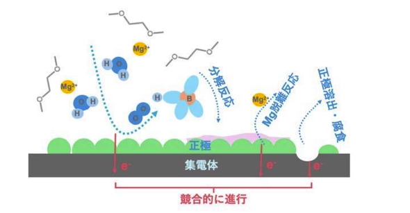北海道大学がマグネシウム電池の劣化挙動を解明。電解液に含まれる微量の水分が電池部材の腐食や正極の溶出などを促進することが分かったという。