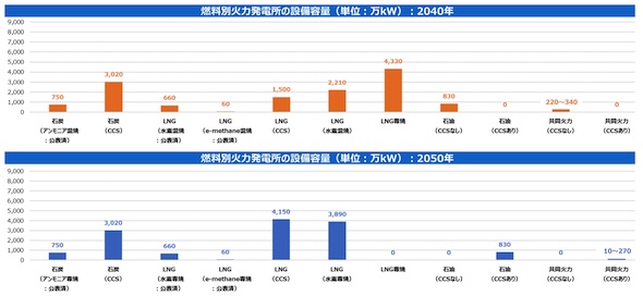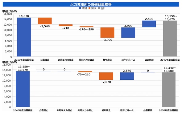 これらの増減をまとめると、火力発電の設備容量は2040年に13,550〜13,670万kW、2050年に13,340〜13,600万kWと想定され、2019年度と比べ6〜8%の減少となる。
