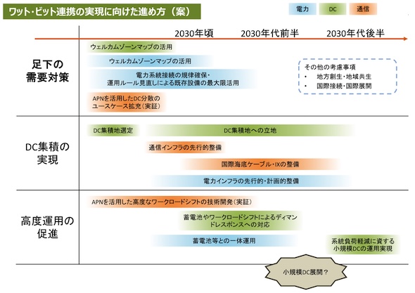 ワット・ビット連携官民懇談会では、DC整備の中長期的な対策として、特定のエリアに電力・通信インフラを計画的に整備し、DCを誘導することにより、全体最適化を図ることを掲げている。