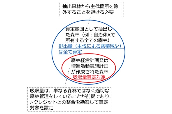 このため特定排出者は、全国で所有する森林のうち、一部を抽出してSHK制度の算定範囲とすることができることとした。ただし、主伐による蓄積減少を意図的に除外することを防ぐため、市町村単位での地理的まとまりにより抽出することなどが条件となる。