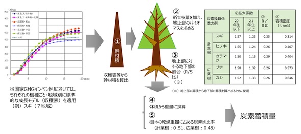 先述の通り、SHK制度では地上部バイオマスと地下部バイオマスのみを算定対象としており、これら「生体バイオマス」の炭素蓄積量は、【(①幹材積)×(②拡大係数)×(1+(③R/S比))】×(④容積密度)×(⑤炭素含有率)という計算式により算定される。「幹材積」は、森林簿データ又は実測値を使用する。