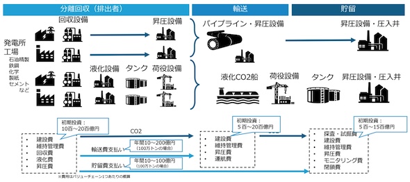 CCSのバリューチェーンは、CO2の「分離回収」、「輸送(船舶輸送の場合は液化・貯蔵を含む)」、「貯留」から構成される。ただし、2030年時点では、専業の分離回収事業者ではなく、CO2排出者が自ら分離回収を行う形態が想定され、回収したCO2は輸送・貯留事業者へ受け渡すことが基本的なビジネスモデルと想定される。このとき、CO2の分離回収はCO2排出者の社内コストとなり、輸送・貯留は、これらを請け負う事業者の役務に対して費用(料金)の支払いとして発生する。