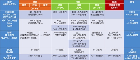 現時点、CCS事業のライフサイクルコストの予見性は高いとは言えないが、地球環境産業技術研究機構(RITE)では、一定の前提条件を置いた試算を行っており、「石炭燃焼排ガスからのCO2分離回収、パイプライン輸送、貯留」というケースの場合、総額約4,100億円〜1兆1,300億円という試算結果が示されている(LNGの場合、総額約7,200億円〜2兆円)。