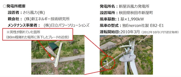 新屋浜風力発電所は、新屋海浜公園内に設置された風車1基からなる発電所。事故報告書によると、破損した風車の破片は風下約250mにわたって、公園のあちこちに飛散していたという。