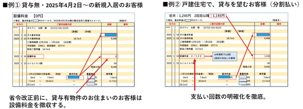 このため改正施行規則では、新規契約についてはエアコン等の設備費用をLPガス料金へ計上することを禁止(賃貸住宅では、ガス器具等の費用も禁止)するとともに、新規・既存契約のいずれも、基本料金、従量料金、設備料金からなる三部料金制(設備費用の外出し表示)を義務付けている。
