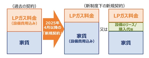 従来、一部のLPガス事業者では、LPガスの小売契約獲得を目的として、ガス器具や電気エアコン、インターホン、Wi-Fi機器等の設備をアパートオーナー等の不動産関係者に「無償貸与」することが行われていた。これらの設備費用は、アパート入居者が支払うLPガス料金から回収するため、LPガス料金が高額かつ不透明となる一因となっていた。