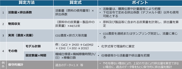 また、温対法に基づく算定報告公表制度(SHK制度)等を踏まえ、表1の1〜4の算定方法を原則として、算定に必要な証憑類の入手が出来ない場合などの例外的措置として、保守的な方法により排出量を推計する方法も認めることとする。