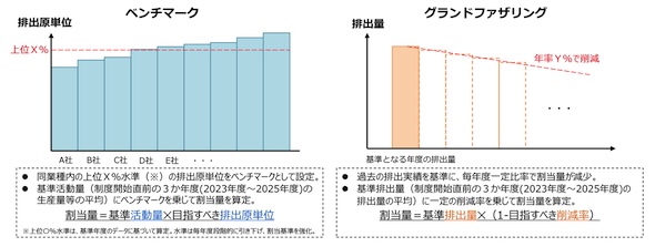 ベンチマークの設定が困難な業種では、基準となる年度の排出量に一定の削減率を乗じるグランドファザリング方式によって割当量を決定する。また、各社のこれまでの削減努力や製造拠点の国外移転のリスクを考慮し、排出枠割当量を加算する仕組みも併せて設けている。