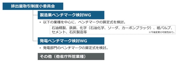 ベンチマークの算定式については、個別業種ごとに専門的な知見を要するため、排出量取引制度小委員会の下にWGを設置し、検討を行うこととする。