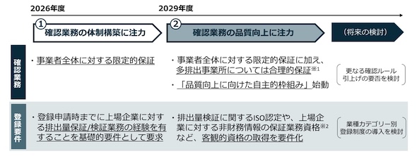 排出量取引制度では排出量の大小が金銭的価値を持つことから、第三者による排出量の検証(確認)が重要となる。このため、本制度において対象事業者は、「1.排出枠割当の基礎となる排出目標量の届出」や「2.保有義務量確定の基礎となる排出実績量の報告」に当たって、「登録確認機関」による確認を受ける必要がある。