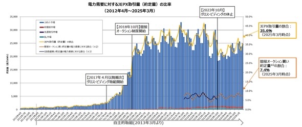 日本卸電力取引所(JEPX)の取引量は、小売全面自由化当初(2016年4月)は総需要の約2%であったのに対し、2025年3月時点におけるJEPX取引量は総需要の35%程度まで増加している。また、直近の2025年1月〜3月におけるJEPXスポット市場の買い入札量は、旧一般電気事業者は404億kWh、新電力等は504億kWhに上る。
