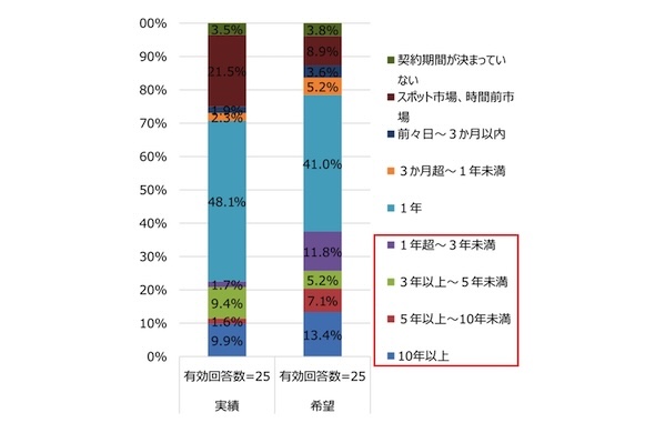 なお、資源エネルギー庁によるアンケート調査(2023年2月時点のやや古い調査であることに留意)において、大手新電力(約8億kWh以上/年)では、契約期間が中長期(1年超)である電力調達量は、調査当時で約23%、今後の希望としては約38%という回答であり、より長期の契約期間による調達量を増やす意向が見受けられる。