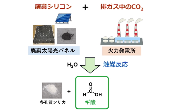 今回研究グループは、実際の廃棄太陽光パネルから分離・回収されたシリコン部位を活用し、火力発電所からの排ガス中のCO2と反応させることで、ギ酸と多孔質シリカを合成する触媒反応の開発に成功した。