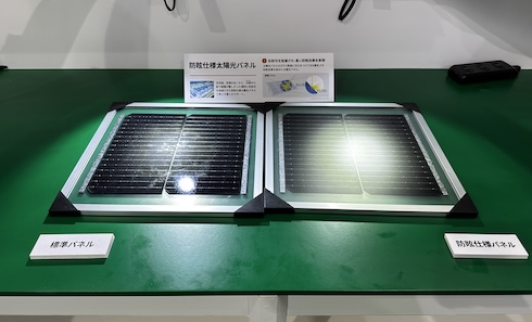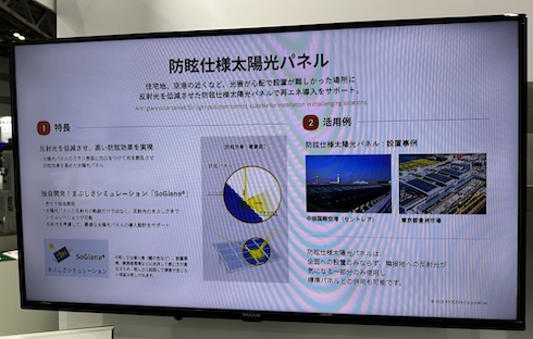 京セラは「自治体・公共WEEK 2025」(2025年7月2〜4日、東京ビッグサイト)に出展し、防眩(ぼうげん)仕様の太陽光パネルや関連ソリューションを展示した。