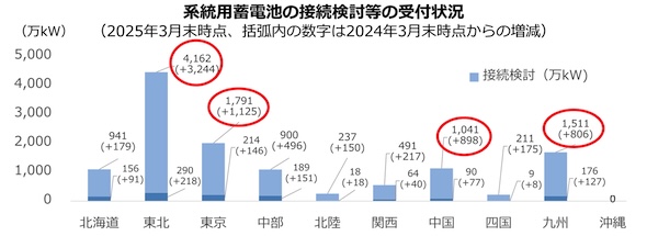国は、蓄電池メーカー等の事業の予見性を高めるため、定置用蓄電池の2030年導入見通しを公表しており、系統用蓄電池は累計14.1〜23.8GWh程度、家庭用、業務・産業用蓄電池は累計約24GWhとしている。ただし実際には、2025年3月末時点で約12GW(3時間率と仮定すると36GWh)の系統用蓄電池がすでに接続契約を行っており、国の見通しを大きく上回るペースで急速な導入が進んでいる。