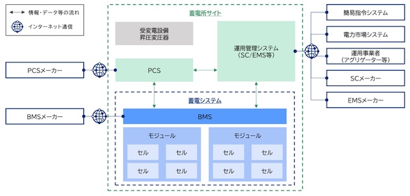 分散型電源の導入拡大やデジタル化の進展等に伴い、電力分野におけるサイバーセキュリティリスクが高まりつつある。系統用蓄電池システム(蓄電所)は一般的に図2のような設備で構成されており、BMS(バッテリーマネジメントシステム)、PCS、SC(サイトコントローラー)/EMS等が蓄電所サイトにおける制御・監視を司るシステムであり、それぞれ電池状態の監視・評価、充放電制御、出力配分最適化等の機能を有している。
