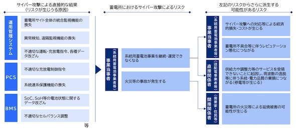 蓄電所に対してサイバー攻撃が行われた場合、蓄電所の運転停止または火災等の事故の発生により、蓄電所事業者自身や近隣住民等に影響が生じるほか、電力の安定供給を損ねる恐れもある。このような直接的/間接的な影響も踏まえ、社会的コスト最適化の観点から、関係者間でサイバー攻撃によるリスクのシェアと対応の在り方について検討することが求められる。