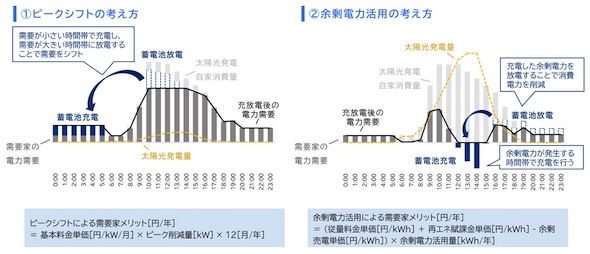 太陽光発電の導入を前提として、昼間の余剰電力を蓄電システムに充電し、夜間等にこれを自家消費し、買電量(つまり従量料金)を低減する活用法である。(具体的な収益試算方法は図5を参照)