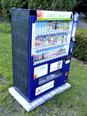 サントリーとPXPは、軽量で曲げられるカルコパイライト太陽電池を自動販売機に設置する実証実験を開始する。