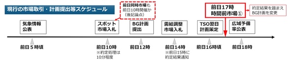 なお、前日開催の時間前UC市場は、実需給に向けた発電計画・需要計画や、送配電事業者の翌日計画、広域機関の広域予備率策定のベースとなる取引の場を提供するものである。現在の計画提出等のスケジュールは図4のように、前日12時にバランシンググループ(BG)計画が提出され、需給調整市場の入札・約定を経て、16時〜17時頃に一般送配電事業者(TSO)が翌日計画を策定し、前日18時に広域機関が広域予備率を公表している。