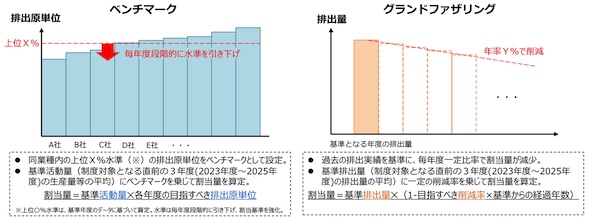 本制度では、排出枠の割当は可能な限り、「ベンチマーク方式」を適用することとしており、ベンチマークの設定が困難な業種については、基準となる年度の排出量に一定の削減率を乗じる「グランドファザリング方式」を適用することとしている。