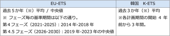 また、すでに日本では2023年度からGX-ETSの試行期間(第1フェーズ)が運用されており、多くの企業が2023〜2025年度の排出量の算定・検証を行っている。これらを踏まえ、GX-ETS第2フェーズでは、制度対象となる直前の3カ年度(2026年度から制度対象となる一般的なケースでは2023〜2025年度)を基準とすることとした。