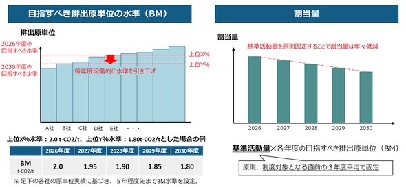 図2左の例では、2026年度から2030年度に向けて、目指すべき排出原単位(t-CO2/t)を直線的に引き下げていく案が示されている。このような段階的引き下げは、一種の激変緩和的な効果があると考えられる。経済産業省では、NDC(国が決定する貢献)の更新頻度も念頭に、5年程度先までベンチマーク水準を設定する予定としている。