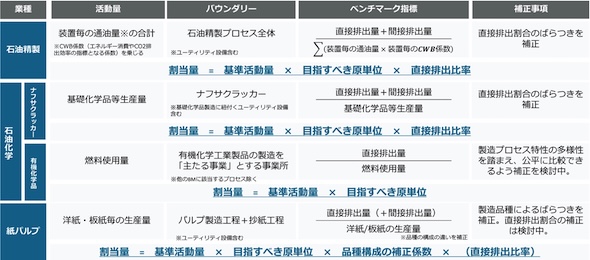 なお、排出量取引制度小委員会の下に設置された「製造業ベンチマークワーキンググループ」では、業種ごとのベンチマーク案が検討されており、現時点、3つの業種(石油精製業、石油化学工業、紙パルプ製造業)におけるベンチマーク案が示されている。