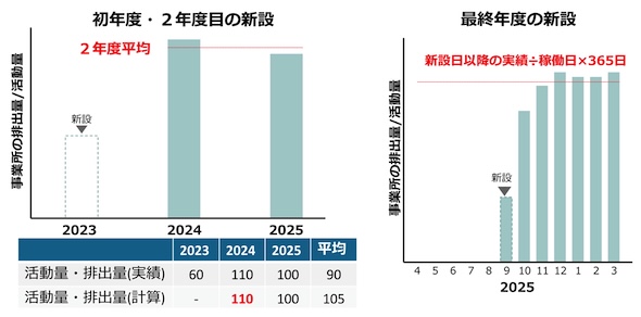 まず、基準期間中に新設された事業所については、図3のように、新設の翌年度以降の平均値を基準とする方法(左図)と、基準期間の最終年度(3年度目)に新設された事業所については、新設日以降の日割りの排出量×365として基準活動量・排出量を算出する方法(右図)の2案が事務局から示された。