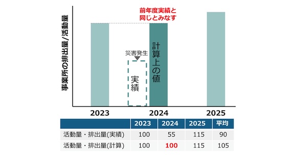 このため、特定非常災害法や激甚災害法の指定、災害救助法の適用を受けた地域に所在する事業所については、指定期間内に属する年度の活動量・排出量実績を用いずに、前年度と同じであると見なして、基準活動量・排出量の3カ年度平均を算出することを認めることとする。