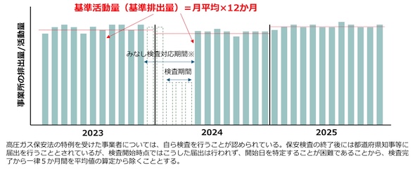 また、法令に基づく保安検査対応による活動量・排出量の減少についても、同様の調整措置が必要である。例えば、高圧ガス保安法に基づく保安検査に伴い設備の稼働を停止した事業所については、検査が完了した月以前の5か月間を除く期間の稼働実績に基づいて活動量・排出量の平均値を算出することを認める。