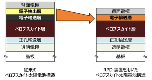 RPD法は物理気相成長法(PVD)の一種で、「低温・低ダメージ」「大面積・高速成膜」「危険性がなく、環境負荷も小さなガスの利用」などの特徴があり、ペロブスカイト層上への成膜や量産性、環境親和性に適している。酸化スズは安価に手に入る金属酸化物であり、PVDで成膜すると優れた導電性を持つ膜になる。