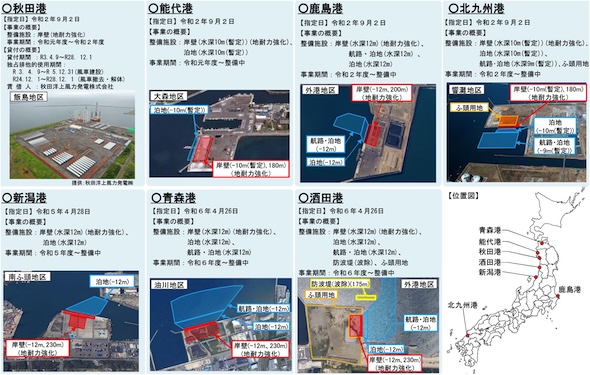 洋上風力産業拡大のためには、基地港湾等のインフラ整備も不可欠であり、港湾法に基づき、これまでに7港の基地港湾の指定・整備が進んでいる。これに加え、2025年4月に改正港湾法が成立し、今後の更なる案件の増加に備えた基地港湾の円滑な利用のための制度が創設された。