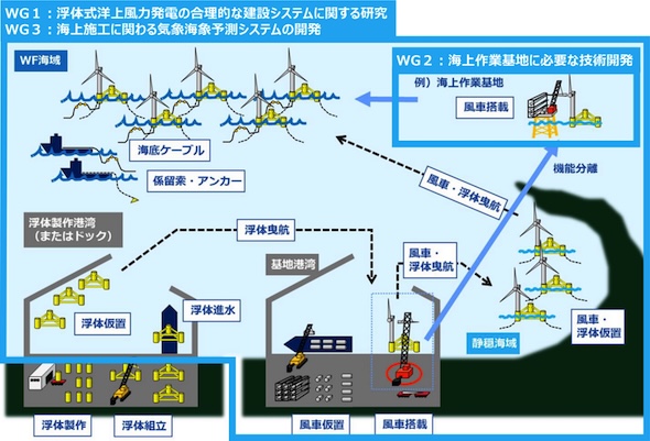 また海洋土木建設会社等は、「浮体式洋上風力建設システム技術研究組合(略称:FLOWCON)」を設立し、浮体式洋上風力発電の大量迅速な施工や合理的な建設コストの実現を目的とした研究開発を進めている。