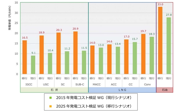 2015年版と2025年版の最大の違いは、CO2対策コストも含めた火力発電所の発電単価である。2025年版では、CO2対策コストの上昇により石炭火力の発電単価がLNG火力より高価となり、燃種毎のメリットオーダーが従来のメリットオーダーから変化する(LNG火力が優先的に稼働する)こととなった。