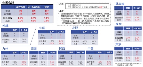 昨年実施したシミュレーション(2029年度を想定)と比較すると、今回のシミュレーションでは、再エネ電源や蓄電池の導入拡大により、ローカル系統の混雑設備数が東日本の3エリアを中心に増加している。