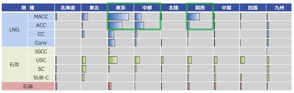 先述図2の発電コストの変化により、今回のシミュレーションにおける「移行シナリオ」では「現行シナリオ」と比べ、LNG電源の稼働が高まり石炭電源の稼働が低下することとなる。図4のように、LNG電源は一部のエリアに集中しているため、東北・東京・中部のLNG電源が接続する基幹系統にて混雑が増加する一方、関西や中国では石炭電源の稼働低下により基幹系統の混雑が減少する見通しとなった。