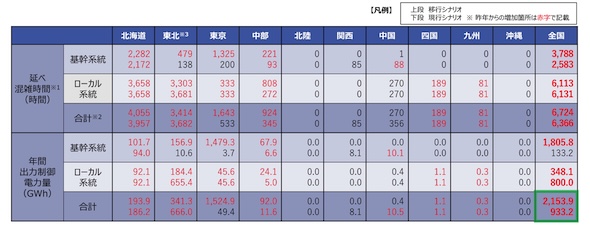 需要が多い時間帯においては電源の出力制御が必要となる系統混雑は発生しにくいため、ピーク需要断面における出力制御は全国で2〜13万kW程度(全国最大需要の0.01〜0.08%)、予備率が最小となる点灯帯(16:00〜20:00)における出力制御は全国で94〜146万kW程度(全国最大需要の約0.90%)と試算された。