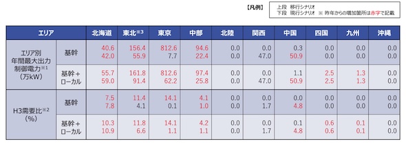 また、2030年度における年間の最大出力制御電力の見通しは表3のとおりである。LNG火力の多い東京エリアでは「移行シナリオ」において、最大で813万kW(エリアH3需要比で14.1%)もの大きな出力制御が必要との試算結果となった。なお、発生時間帯が異なるので本来は単純合計することは適切ではないが、規模感として全国で1,125万kW程度の見込みである。