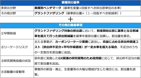 ただし、排出枠の割当てに際しては、事業者の過去の削減努力や、国際競争によるカーボンリーケージの緩和、研究開発投資の維持などを考慮することが重要であり、本制度では、これらの「勘案事項」に応じて排出枠割当量を追加・調整することとしている。